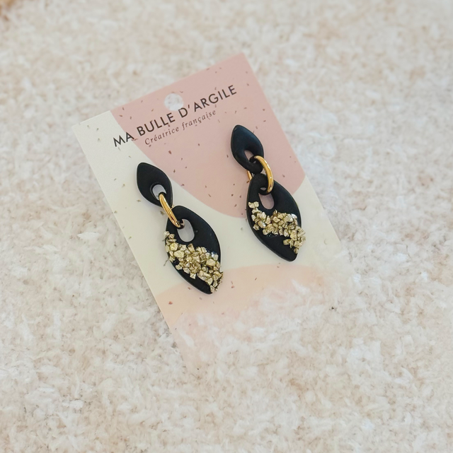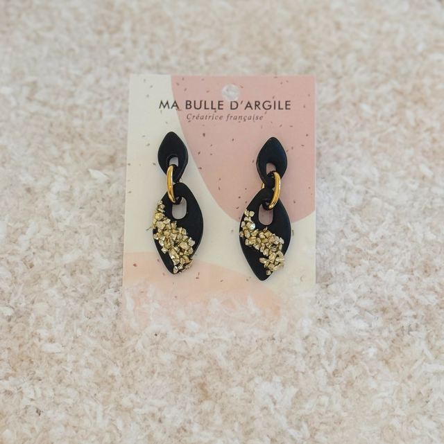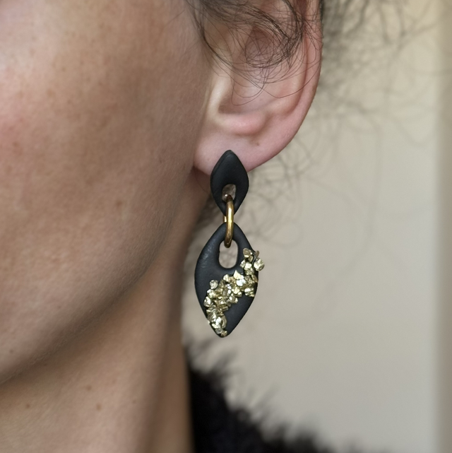 Sur un fond noir avec de grosses paillettes dorées fixées à la résine