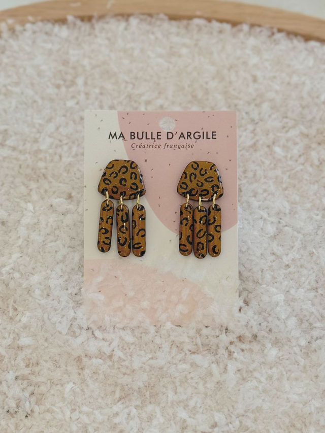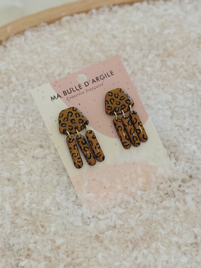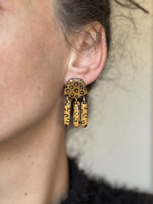 Boucles d'oreilles Abby, sur un fond bronze pailleté avec une peinture léopard noir
